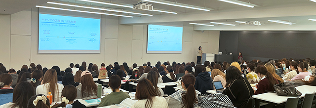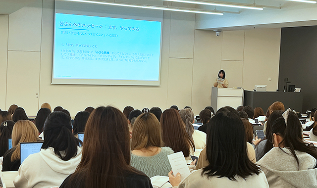 2025年11月12日、武庫川女子大学 経営学部の1年生237名を対象とした「キャリアデザイン特講I」(担当:経営学部 高橋千枝子教授)にて、noa+を運営する株式会社ワークアカデミー執行役員の柴橋静華がゲストスピーカーとして登壇いたしました。本講義では、同大学のキャリア支援施設(資格サポート窓口・リカレント教育センターMUKOnoa+(ムコノアプラス))の運営に携わり、かつ企業の「採用・育成」研修にも携わる柴橋が、1年生の不安に寄り添い、一歩踏み出すためのメッセージを贈りました。