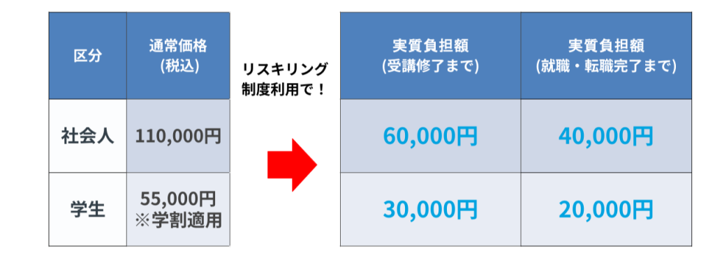 ・経産省リスキリング制度適用の場合:講座受講修了で税抜50%還元、転就職完了で税抜20%追加還元あり