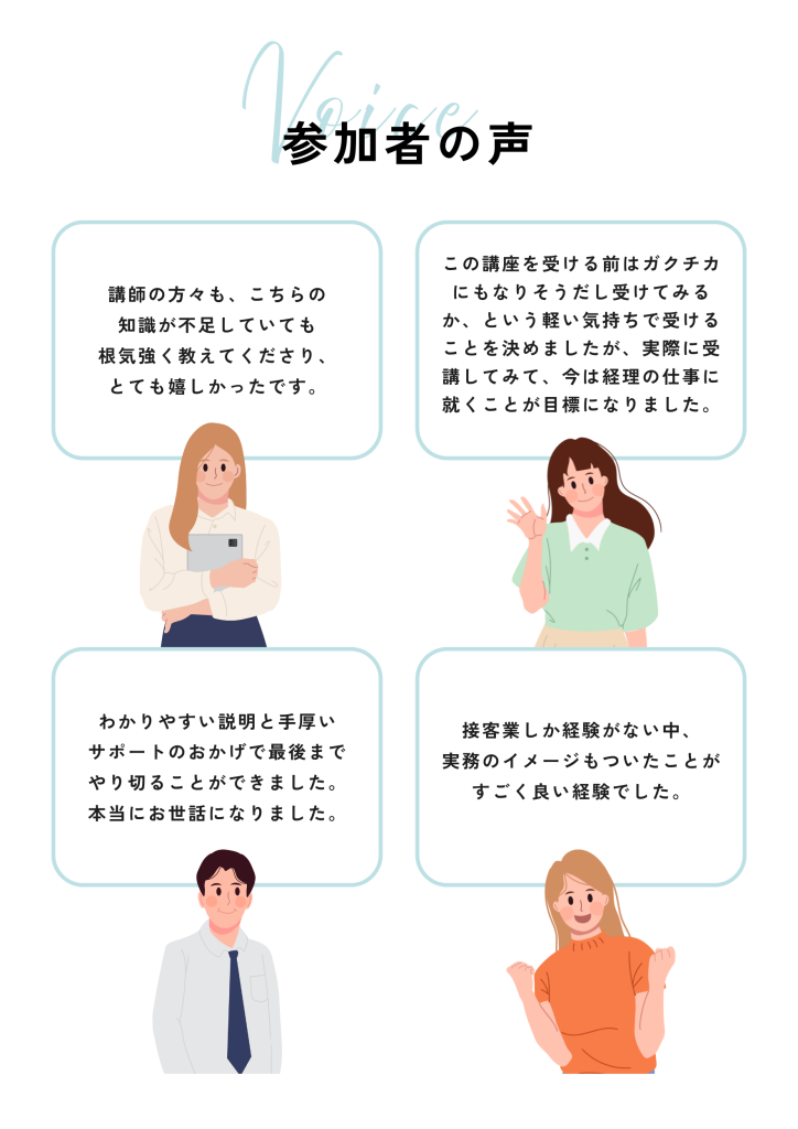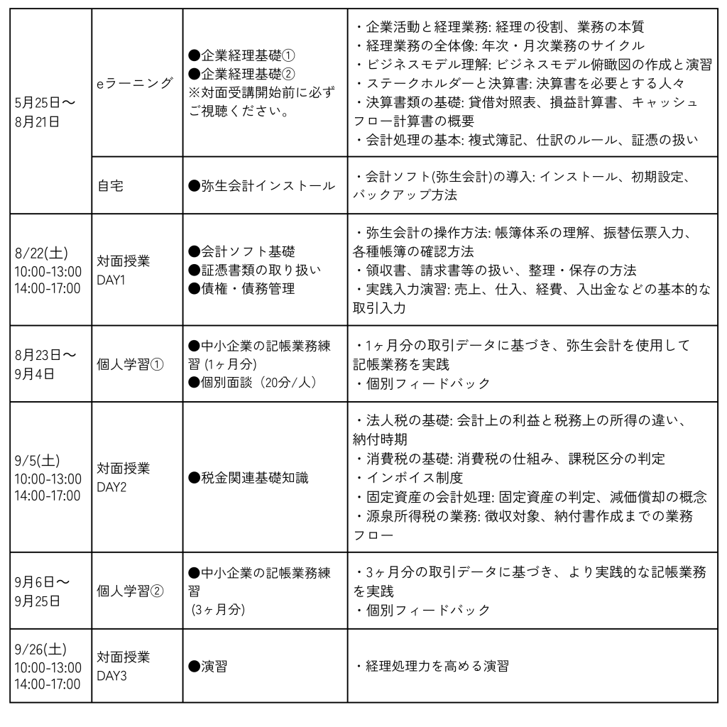 簿記3級の知識をベースに、会計ソフトの操作や帳簿記入、財務諸表の分析まで経理業務の全体像を実践的に学べる3ヶ月の短期集中型育成プログラムです。